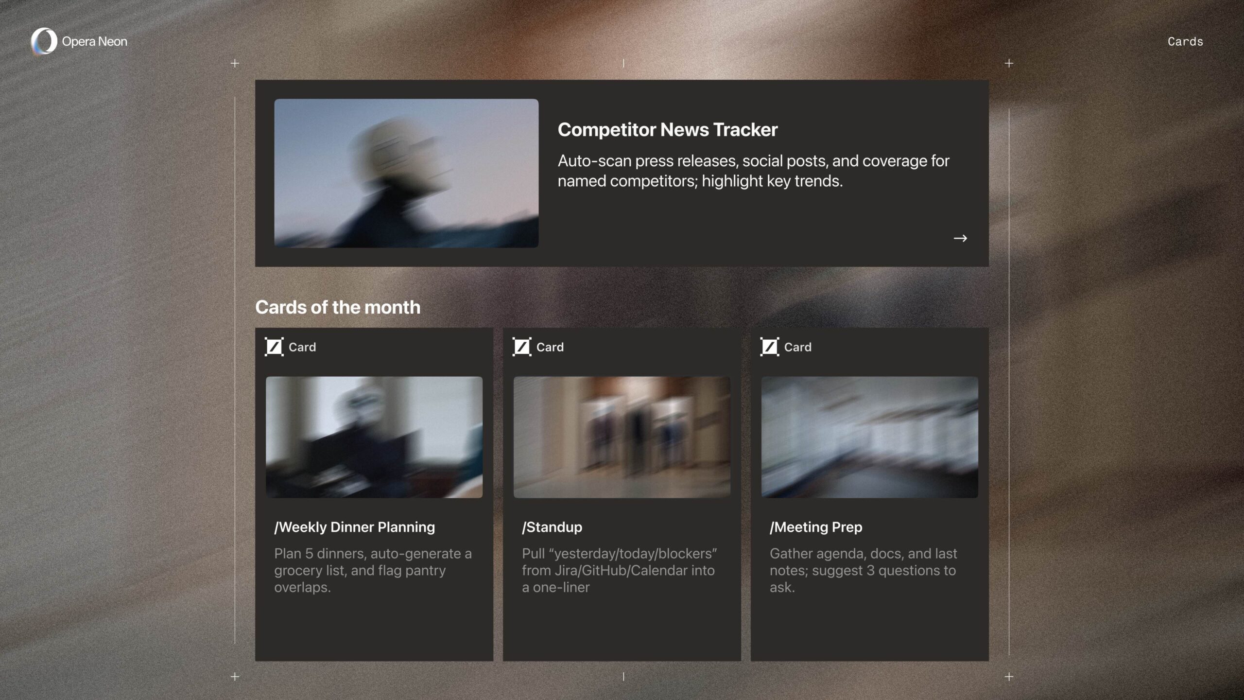 Opera Neon also features Cards – which are reusable prompt instructions that you can use and combine. It’s like having a deck of your favorite AI behaviors ready to use when you need them. Comparing products across tabs? Add the pull-details + comparison-table cards to your prompt. Or if you’re taking meeting notes, combine the key-decisions + action-items + follow-ups cards and Opera Neon will capture what matters in the right format.