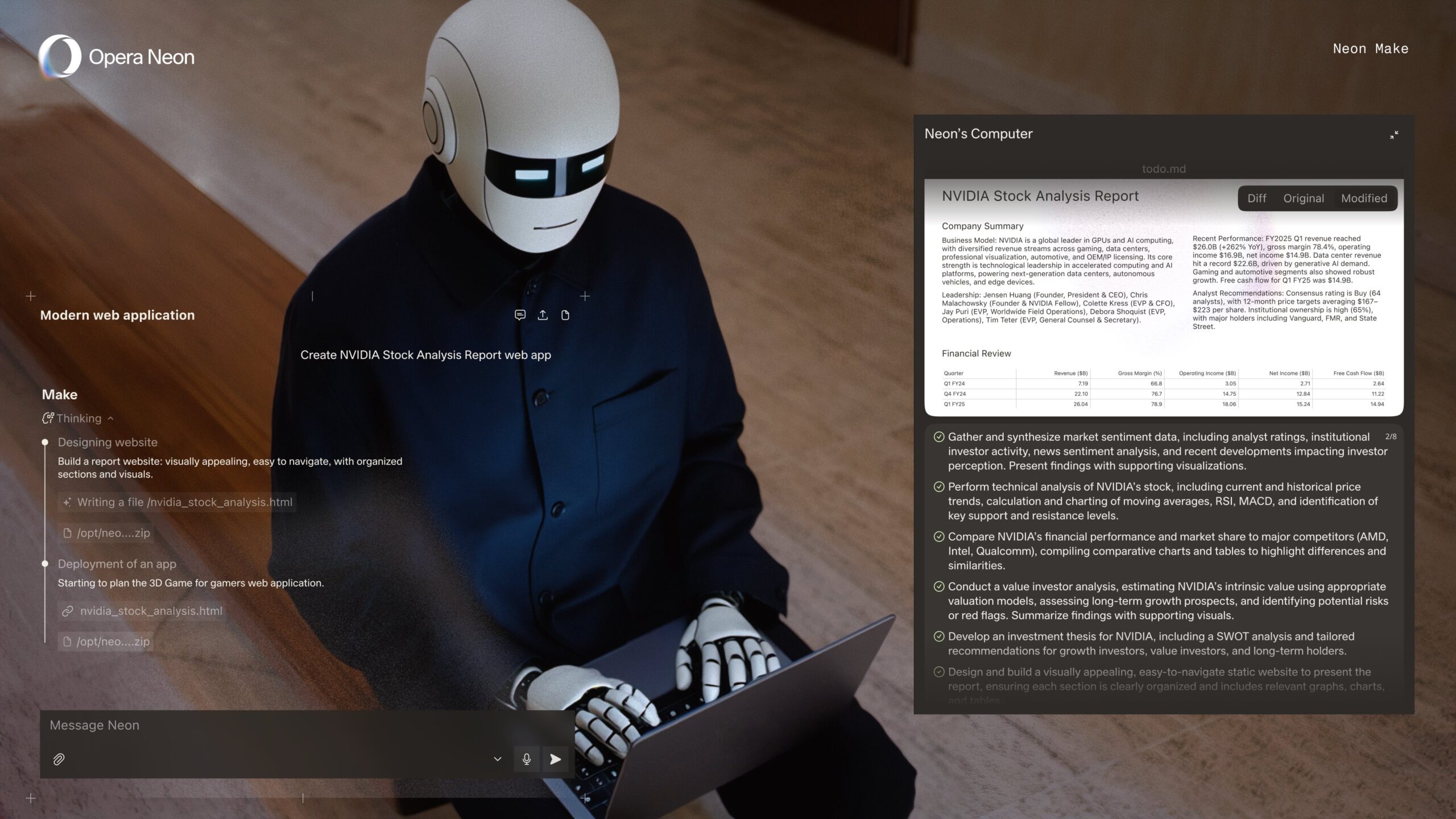 Opera Neon is the next generation AI browser that takes AI power-users to a whole new level and is able to execute complex tasks or even code on their behalf.